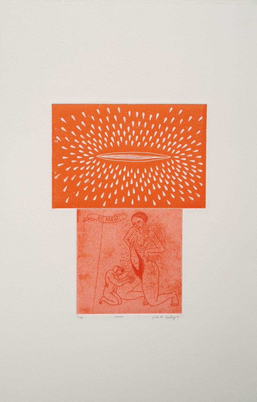 AY MAMI is a small etching (8x8cm) made following the series Show Me Yours, I’ll Show You Mine, here the two characters inhabit the same space, and the giant omnipotent female towers over its devotee. The rest of the prints in this section carry this same theme of the reproductive-erotic-sexual divine feminine.