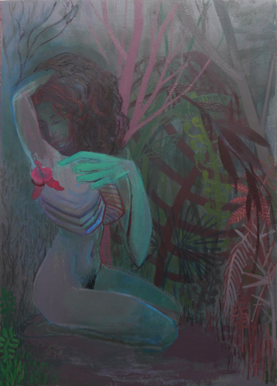 Brotó is an acrylic and oil painting that explores ideals of feminine beauty, representations of the nude female body, fetishisation and exoticisation. The grotesque and monstrous is also hinted at by the oversized alien-looking hand and the protruding ribcage reminiscent of a carcass. The vibrant colours pop in the dimness of the jungle clearing, like the strange growth on her armpit that she curiously examines. Is this alien or part of her?
