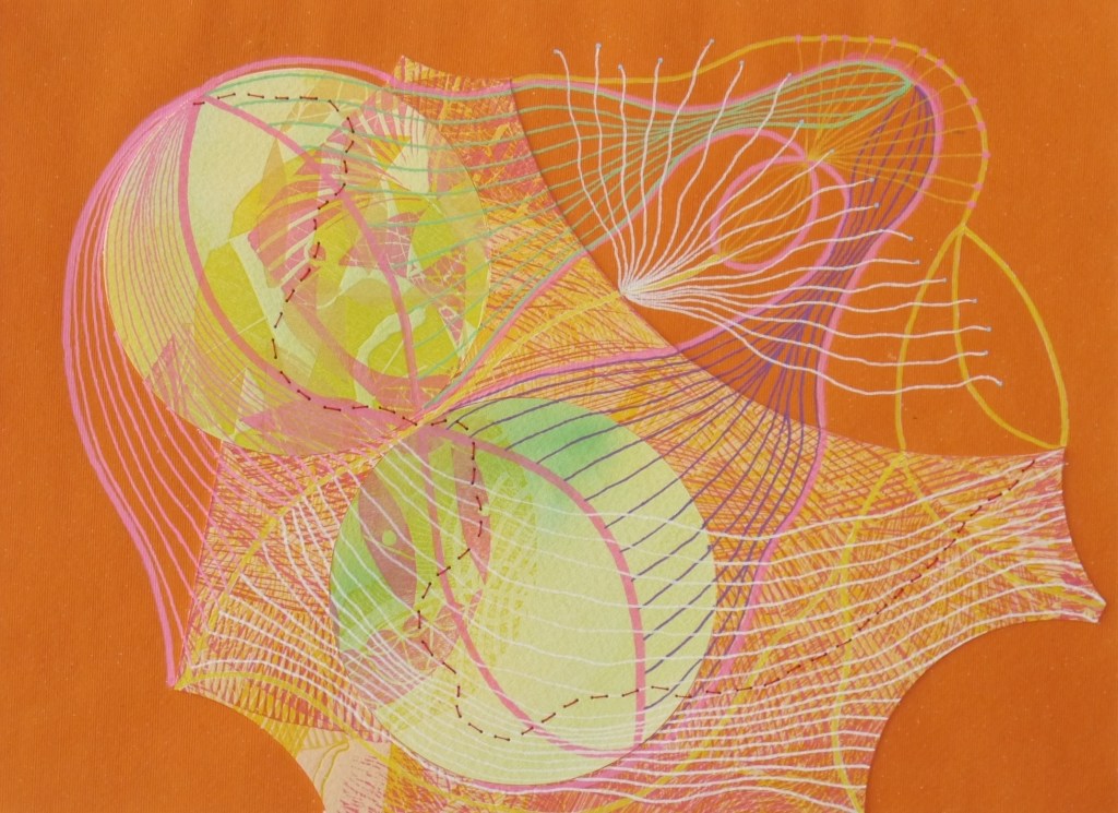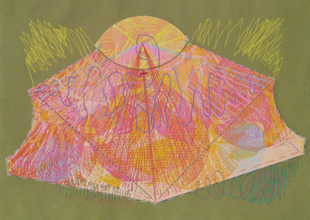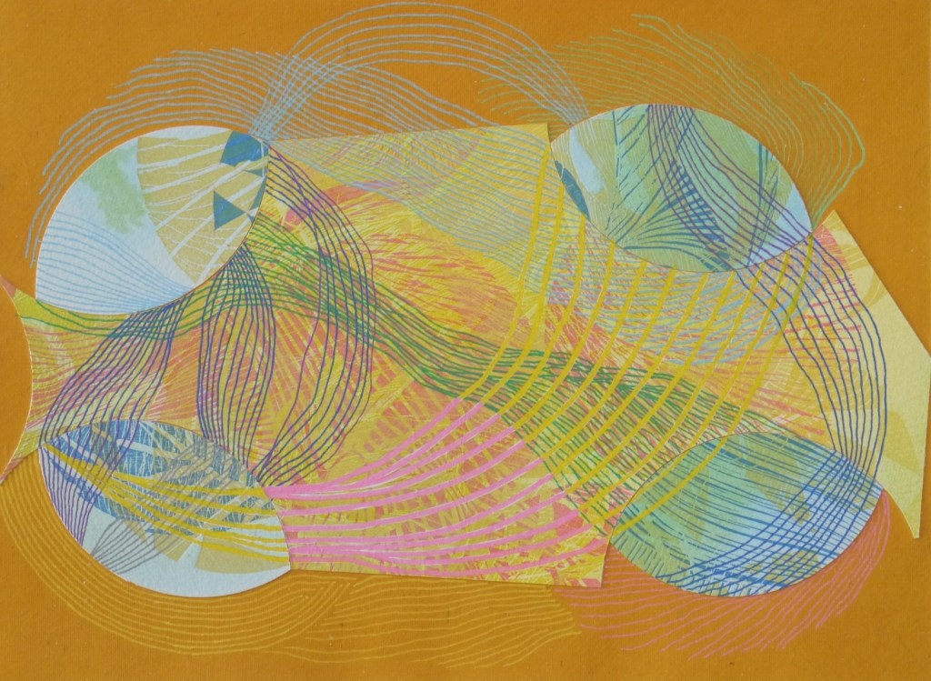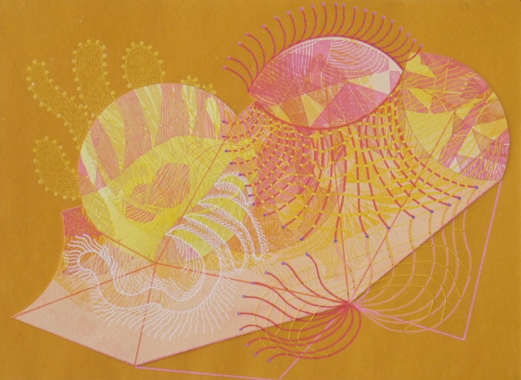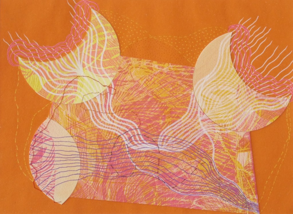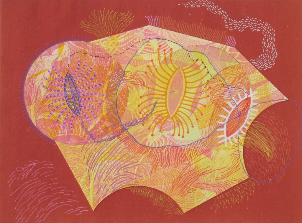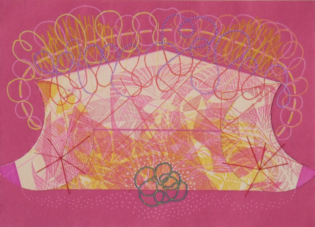 Canesú is a series of 18 works on paper created during lockdown in 2020. The series started by cutting up and rearranging woodcut prints and then reworking on them with drawing, sewing and fabric. The abstract imagery references sewing itself and organic and natural forms and shapes. The creative process was unplanned and intuitive, it unfolded in the making.