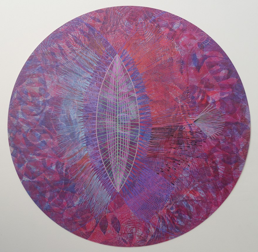 Cochinilla is a unique print made with drawing over woodcut, part of the series Psychotropicalia. It is inspired by marine life and the title (in Spanish) refers to aquatic woodlouse. Born out of experimentation and chance, the round shape of the plate has been used to twist and turn with every layer, producing an unforeseen combination. The plate was carved with no preconceived result in mind, the design unfolding in the making, inspired by the process itself. Similarly the re-wroking of the image with line drawing followed an intuitive process.