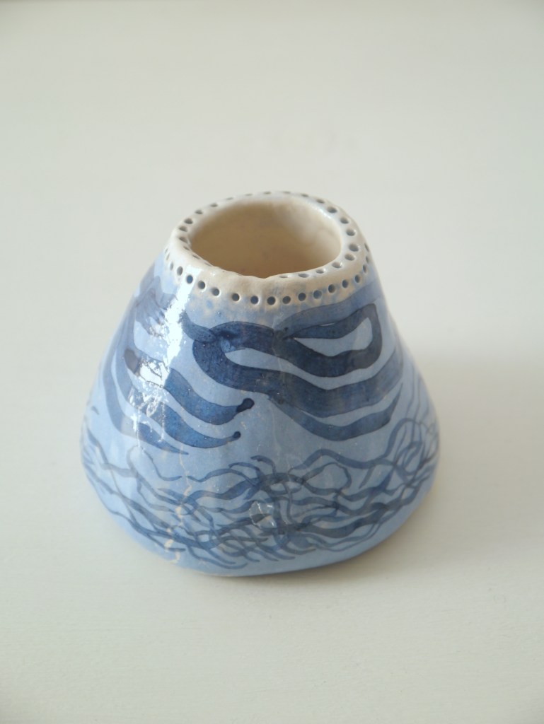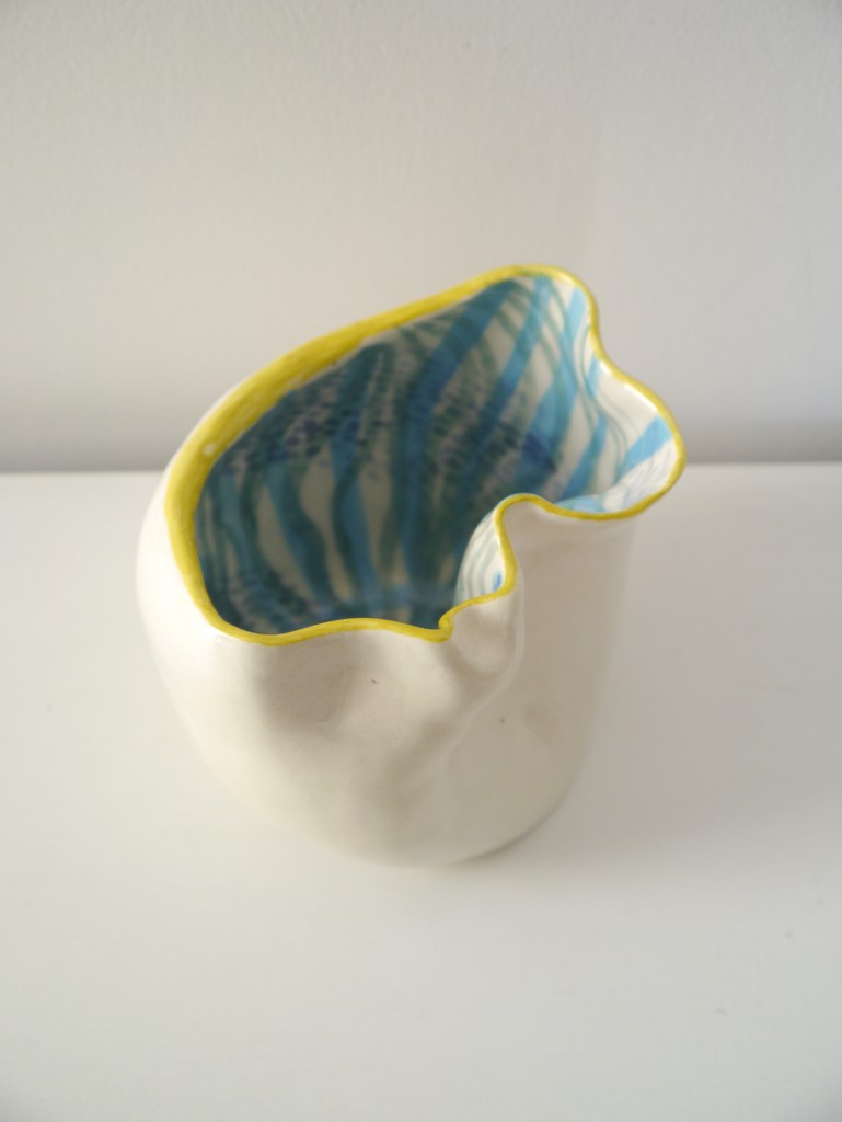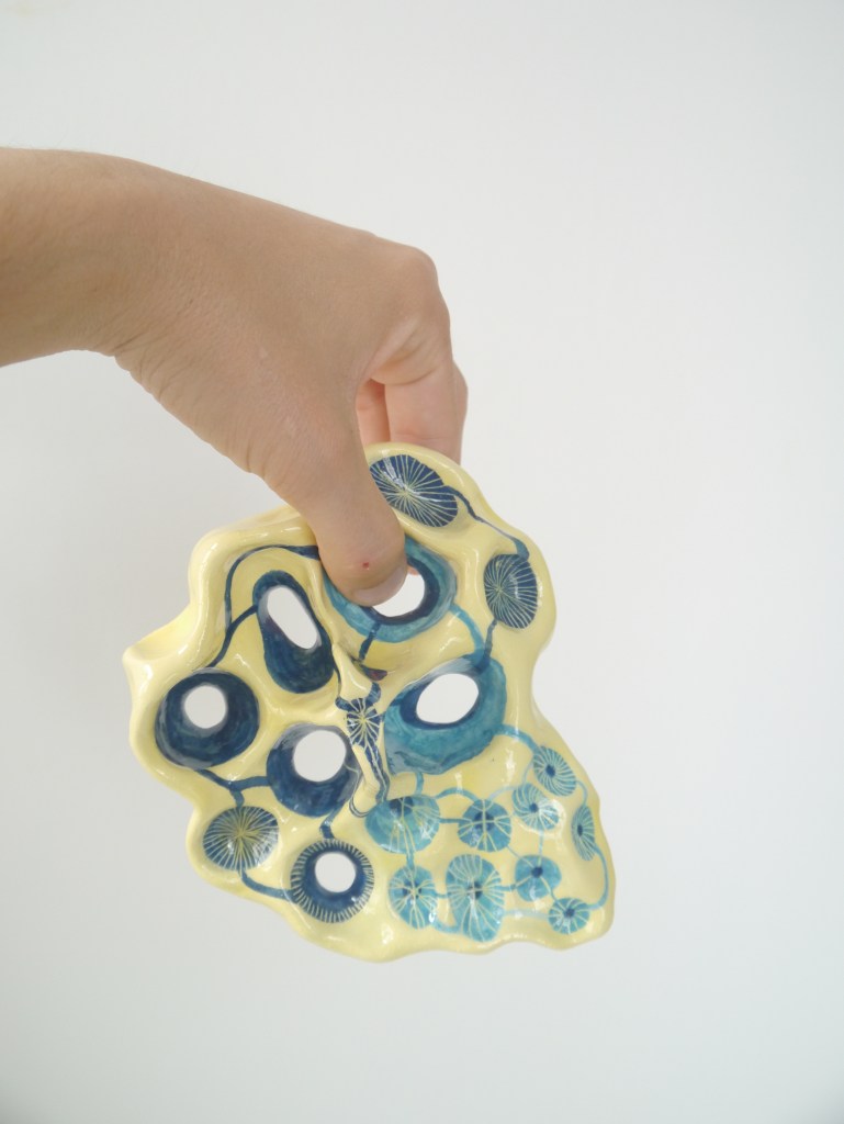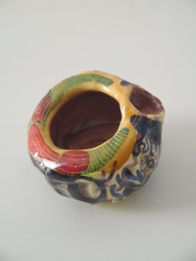 Fueron creadas pensando en la cerámica como un material escultórico, explorando las posibilidades de modelar y construir con barro y de añadir color y textura. Me interesaba generar obras abstractas a partir de un proceso intuitivo basado en la improvisación y el placer de hacer con las manos. Sin ninguna idea prevista de lo que quería hacer, sin ningún plan, poniendo las manos a trabajar y dejándome llevar. Debido a mi limitada práctica con la cerámica, la experiencia resultó ser muy didáctica, iba aprendiendo según hacía y lo ‘errores’ o accidentes en vez de equivocaciones eran tomados como cambios de rumbo inesperados dentro de la evolución de la pieza. El proceso creativo siempre avanzaba con una incógnita: ¿cómo seguir? y los sentidos se ponían a buscar la belleza, entendiendo lo estético como aquello que produce sorpresa y placer al mirarlo.