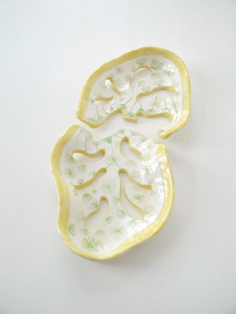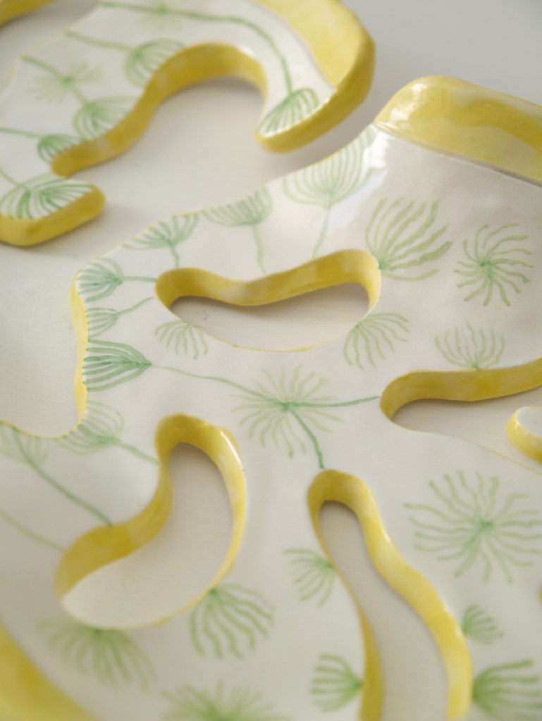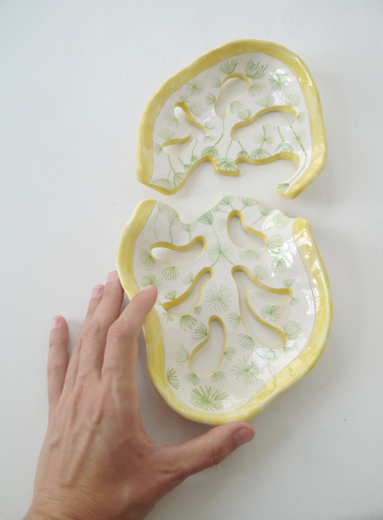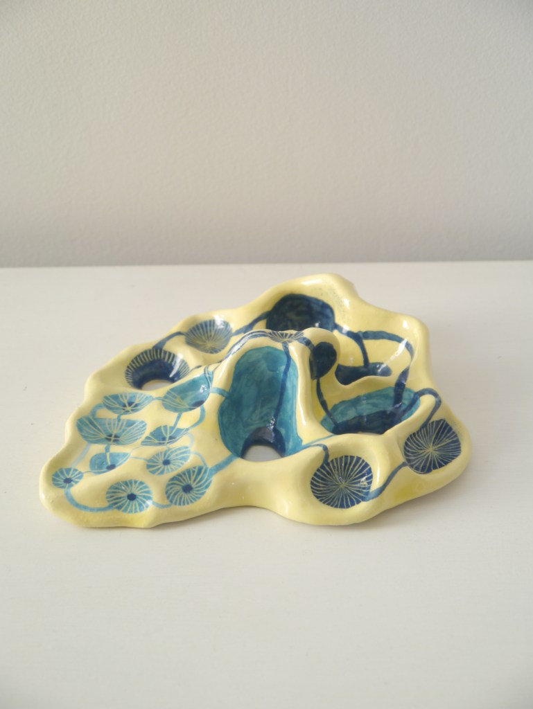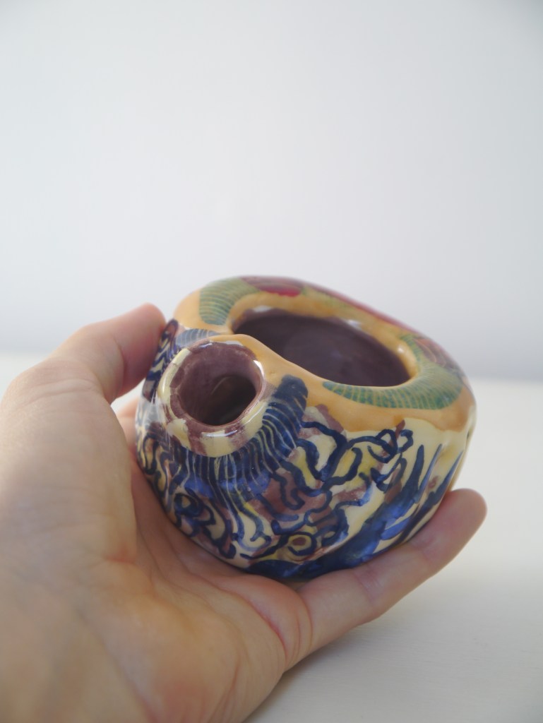 Fueron creadas pensando en la cerámica como un material escultórico, explorando las posibilidades de modelar y construir con barro y de añadir color y textura. Me interesaba generar obras abstractas a partir de un proceso intuitivo basado en la improvisación y el placer de hacer con las manos. Sin ninguna idea prevista de lo que quería hacer, sin ningún plan, poniendo las manos a trabajar y dejándome llevar. Debido a mi limitada práctica con la cerámica, la experiencia resultó ser muy didáctica, iba aprendiendo según hacía y lo ‘errores’ o accidentes en vez de equivocaciones eran tomados como cambios de rumbo inesperados dentro de la evolución de la pieza. El proceso creativo siempre avanzaba con una incógnita: ¿cómo seguir? y los sentidos se ponían a buscar la belleza, entendiendo lo estético como aquello que produce sorpresa y placer al mirarlo.