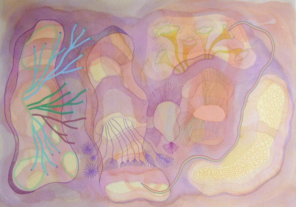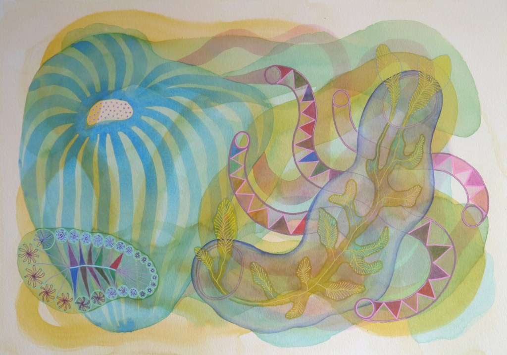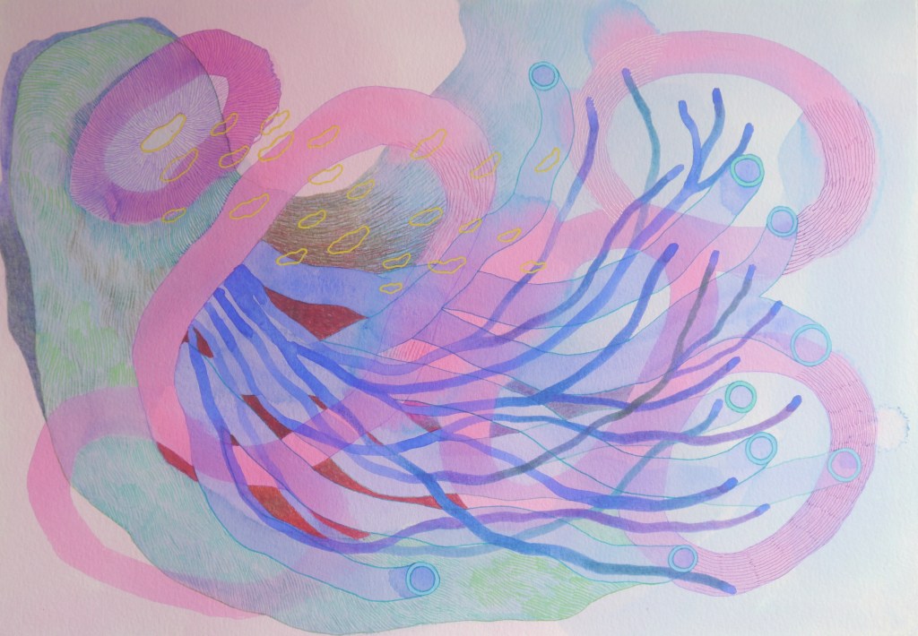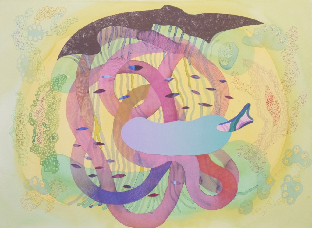 La serie Debajo de las Piedras consiste de 20 dibujos realizados en acuarela, técnicas de dibujo (lápices, bolígrafos y rotuladores de colores) y collage. Estas obras orgánicas evocadoras de la vida microscópica y de organismos y paisajes marinos son una continuación de la serie Croma, cuyo proceso plástico se basa en el puro disfrute de crear y dejarse llevar, sorprendiéndose e improvisando a cada paso.