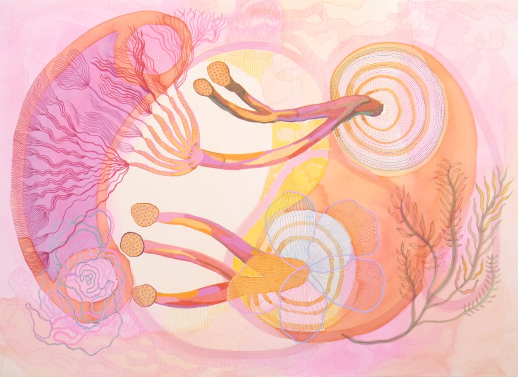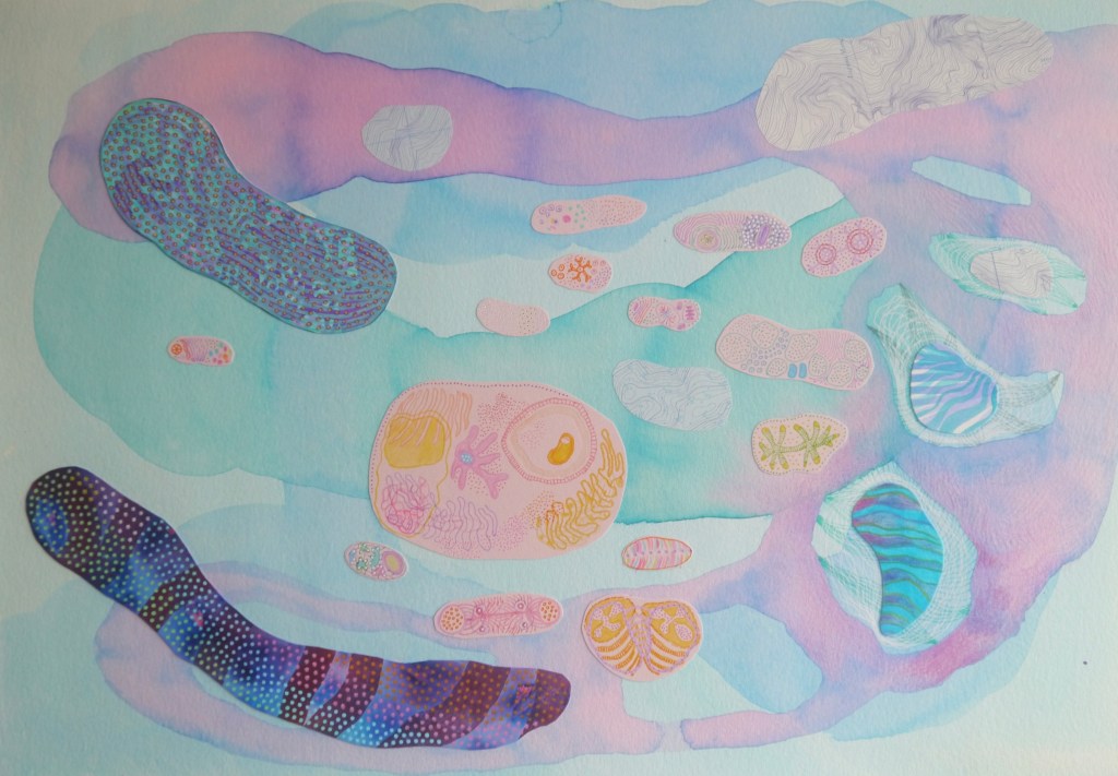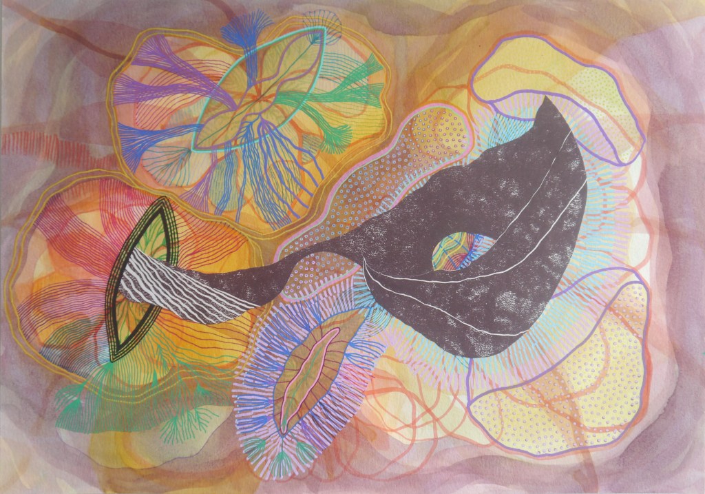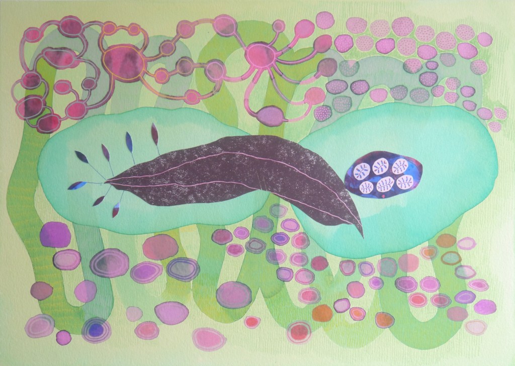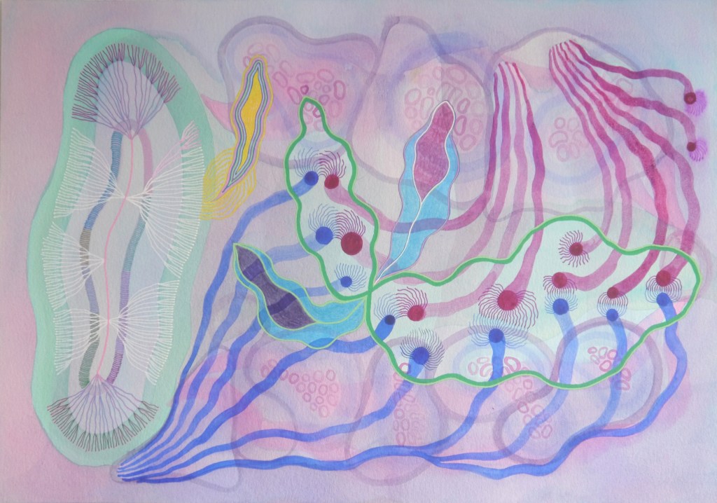 La serie Debajo de las Piedras consiste de 20 dibujos realizados en acuarela, técnicas de dibujo (lápices, bolígrafos y rotuladores de colores) y collage. Estas obras orgánicas evocadoras de la vida microscópica y de organismos y paisajes marinos son una continuación de la serie Croma, cuyo proceso plástico se basa en el puro disfrute de crear y dejarse llevar, sorprendiéndose e improvisando a cada paso.