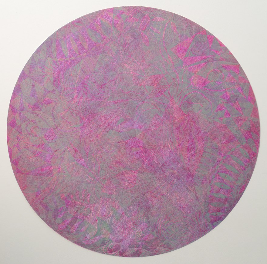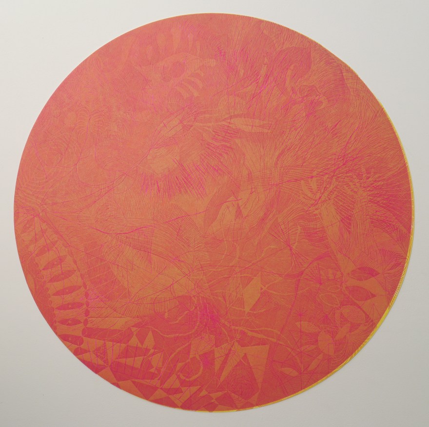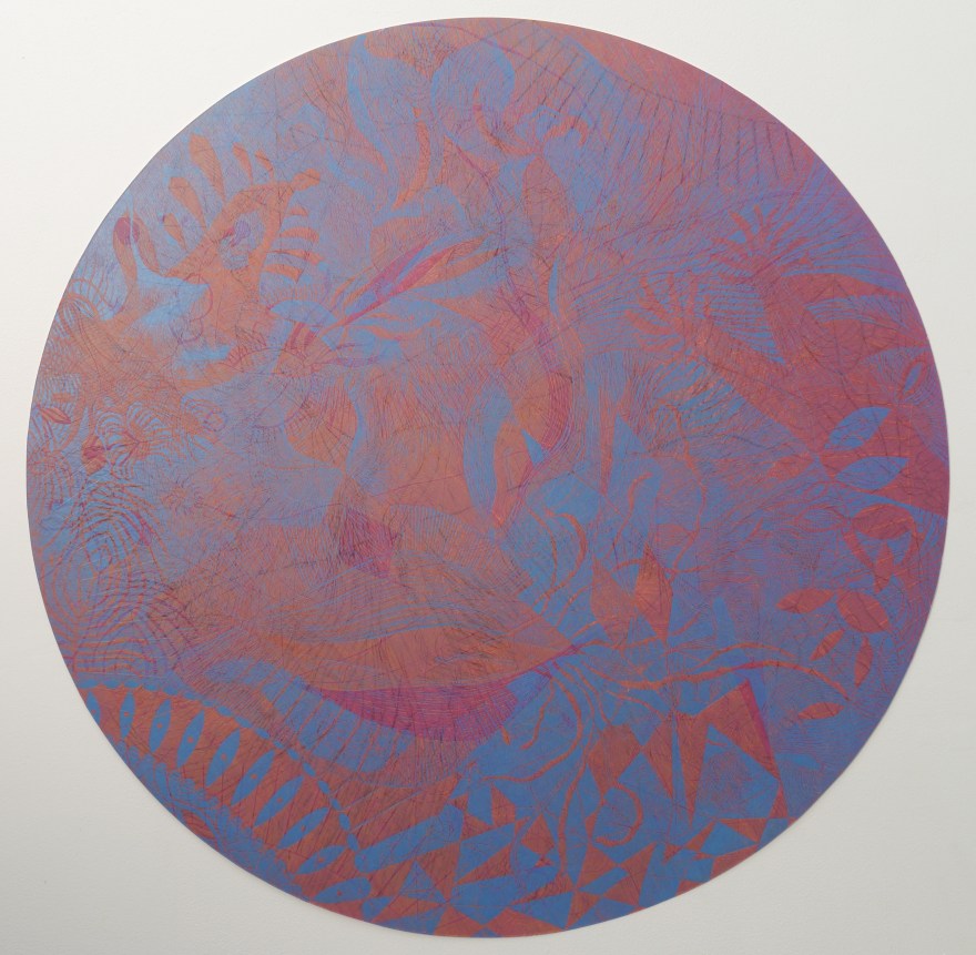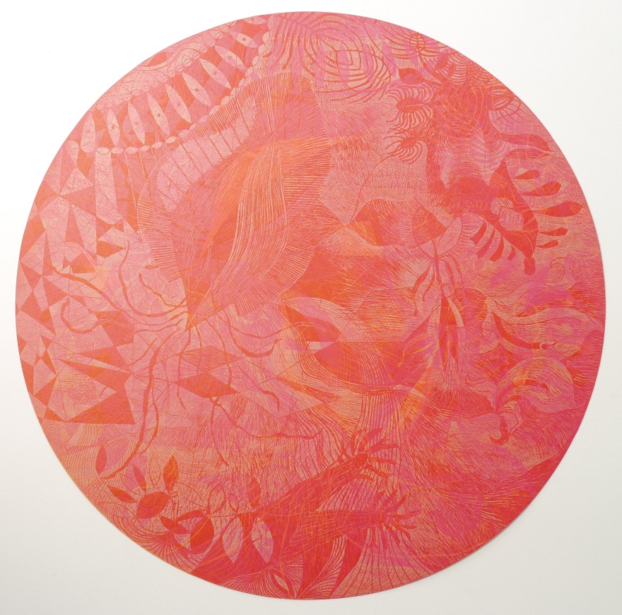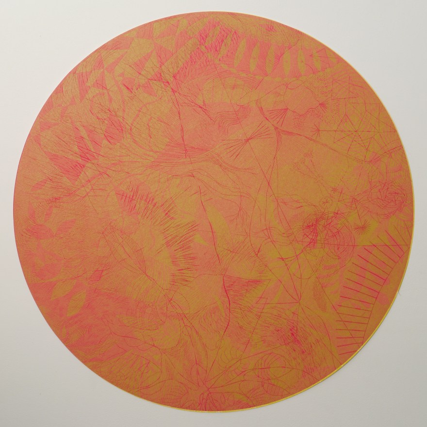 Psychotropicalia is a series of 28 circular reduction woodcuts. These multilayered prints have all been printed from the same plate, as it was progressively carved, each of them is completely unique in its combination of colours, texture and composition. Born out of experimentation and chance, the round shape of the plate has been used to twist and turn with every layer, producing an unforeseen combination for each print. The accumulation of thin veils of ink allows the previous layers to show through the grain of the wood and through the carved lines, marks and shapes. The plate was carved with no preconceived result in mind, the design unfolding in the making, inspired by the process itself.