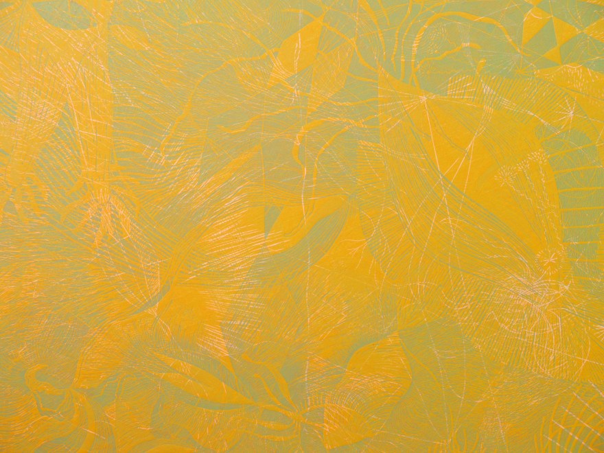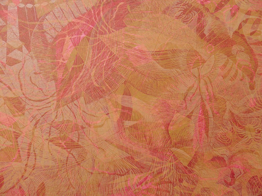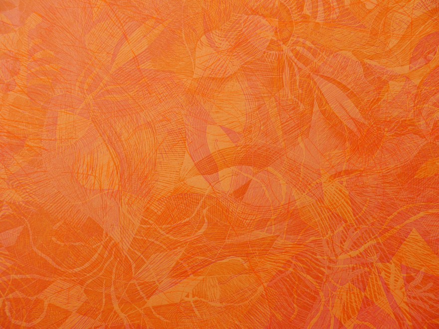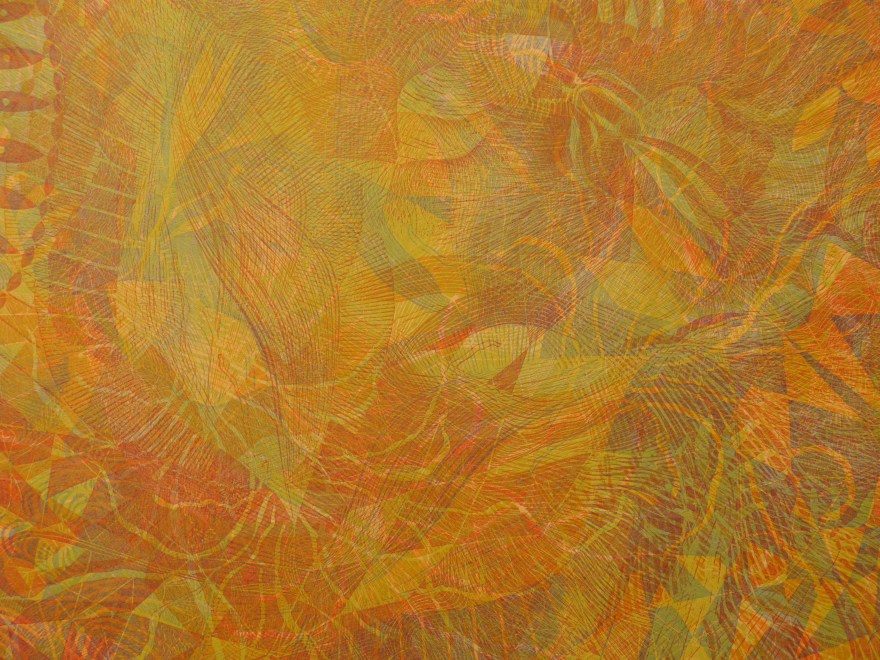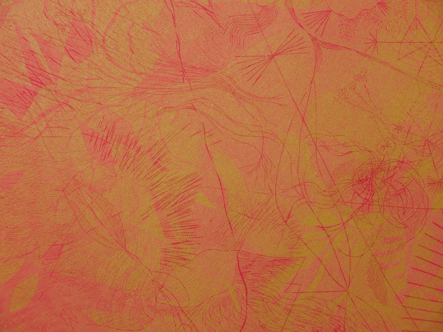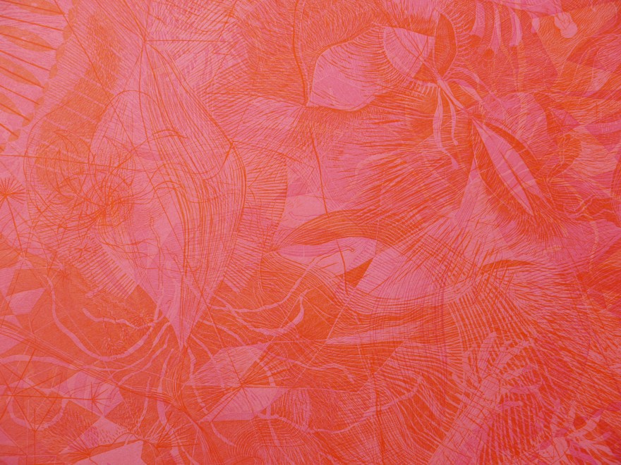 Psychotropicalia is a series of 28 circular reduction woodcuts. These multilayered prints have all been printed from the same plate, as it was progressively carved, each of them is completely unique in its combination of colours, texture and composition. Born out of experimentation and chance, the round shape of the plate has been used to twist and turn with every layer, producing an unforeseen combination for each print. The accumulation of thin veils of ink allows the previous layers to show through the grain of the wood and through the carved lines, marks and shapes. The plate was carved with no preconceived result in mind, the design unfolding in the making, inspired by the process itself.