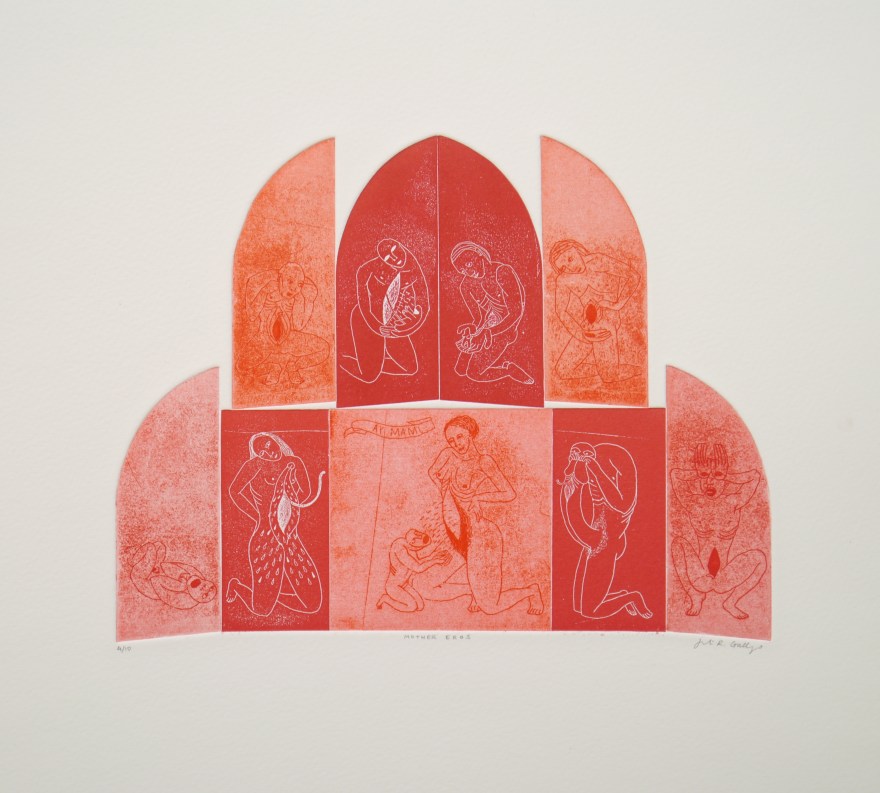 These prints were born out of experimentation with small plates, making compositions that resemble altars, with the Ay Mami plate as central subject. They have to do with ideas, feelings, emotions, reflections and experiences of what female sexuality means/feels to be, what it can or could be, what I imagine and dream it to be, from my particular subjective perspective. Also driven by an impulse to create something that visualises (or makes visible, more visible, visible again), honours and celebrates the sexual, erotic and reproductive capacity, power and potencial of women which is underlooked, undervalued, repressed and oppressed.