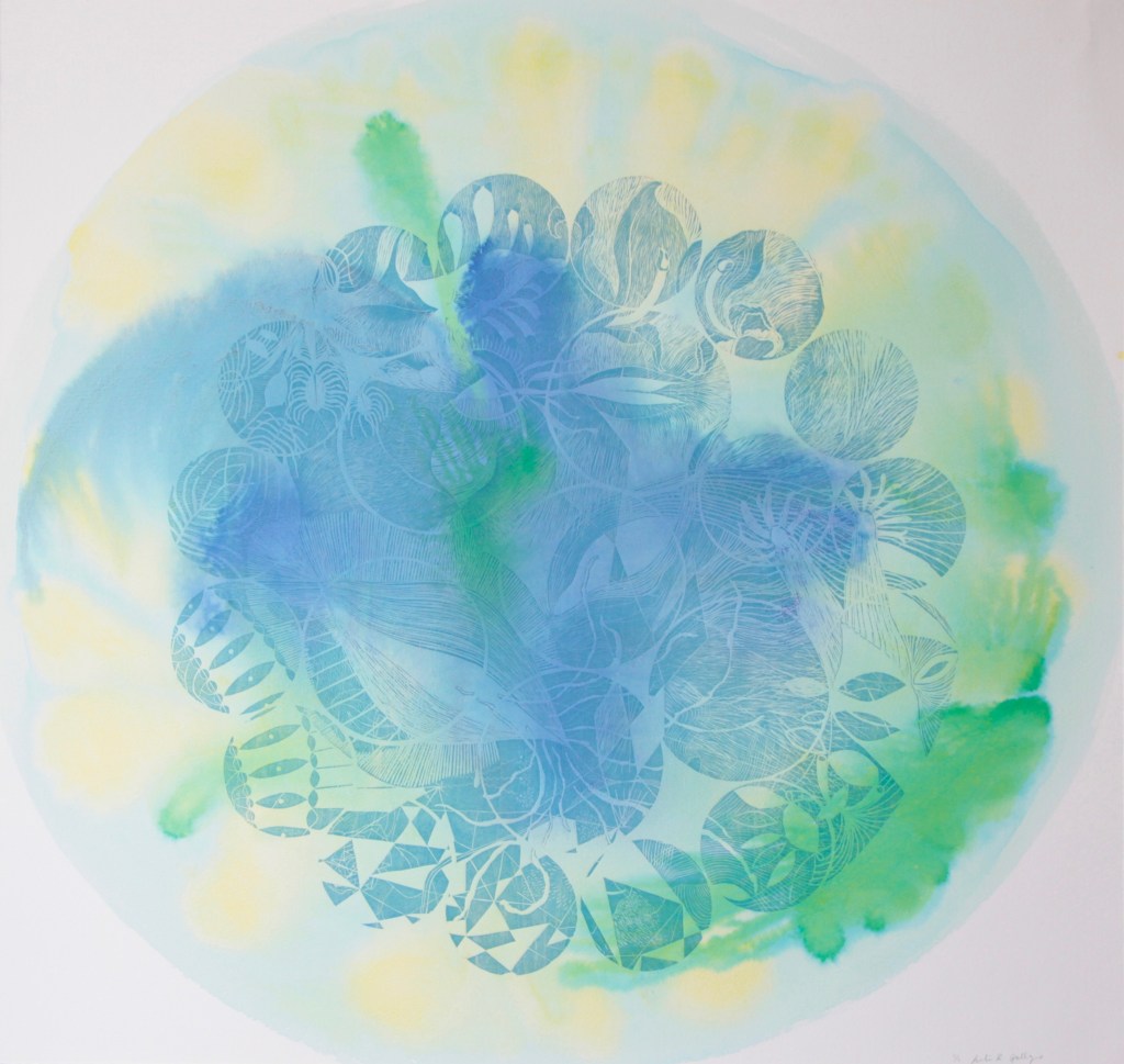 1/1 Untitled (Azul) es una xilografía única con un fondo de acuarela. Fue creada en 2019 mediante la modificación y re-elaboración de la plancha empleada en la serie Psychotropicalia. La plancha de madera fue cortada en círculos que podían moverse y girarse generando infinitas nuevas combinaciones. El proceso creativo estuvo marcado por un espíritu de juego.